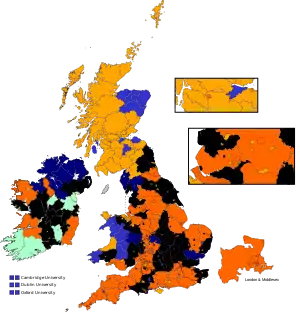 En las elecciones generales del Reino Unido de 1832, las primeras realizadas en el país tras la aprobación del Acta de Reforma de 1832, los whigs obtuvieron una amplia victoria, mientras que los tories obtuvieron menos del 30 % de los votos.