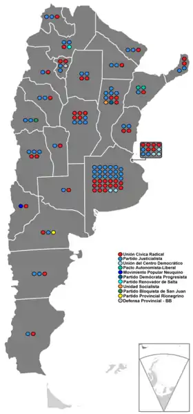 En medio de una fuerte desaceleración económica, más el desprestigio del gobierno ante las leyes de Obediencia Debida y Punto Final, que ponían fin a los juicios contra los crímenes de lesa humanidad cometidos durante la última dictadura militar, el resultado fue una estrecha victoria para el opositor Partido Justicialista (PJ) que obtuvo el 41,29% de los votos y 60 de los 127 escaños en disputa. La oficialista Unión Cívica Radical (UCR) quedó en segundo lugar con el 37,24% de los votos y 52 escaños. Sin embargo, por sus anteriores resultados, la UCR conservó la mayoría simple en la cámara con 118 de las 254 bancas, aunque perdió la mayoría absoluta. En tercer lugar quedó la Unión del Centro Democrático (UCeDé), que experimentó un notorio crecimiento, en contraste con el Partido Intransigente (PI), que quedó por primera vez en su historia en cuarto lugar y prácticamente en la irrelevancia política, al no obtener ningún diputado (pero conservando los 5 que tenía anteriormente). Fue la primera victoria electoral del peronismo desde 1973.