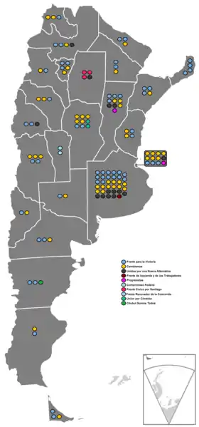 El Frente para la Victoria ganó las elecciones de diputados, siendo la fuerza más votada en 16 de los 24 distritos y obteniendo 60 diputados. Pero el FpV tenía que renovar 77 bancas, razón por la cual perdió diecisiete.[2][3] A comienzos de 2016 el bloque FpV sufrió el desprendimiento de 14 diputados que formaron el "bloque Justicialista".[4][5][6]