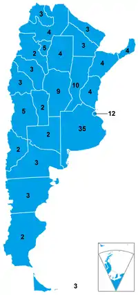 La Cámara de Senadores, según el art. 54 de la Constitución Nacional, se integra con tres diputados por cada distrito electoral (23 provincias y la CABA), de los cuales dos corresponden a la fuerza política con mayor número de votos y uno a la segunda. Los mandatos de los senadores duran seis años y son reelegibles indefinidamente.[11] Para ser senador se debe tener una edad mínima de 30 años.[12]