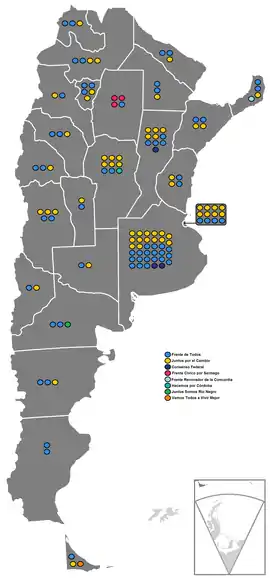 - Tanto el Frente Cívico por Santiago como la lista Vamos Todos a Vivir Mejor disputaron los comicios legislativos compitiendo contra la lista oficial del Frente de Todos. Sin embargo, los senadores de dichas listas que resultaron elegidos posteriormente integraron un bloque unido del Frente de Todos y apoyaron la fórmula presidencial de la coalición.