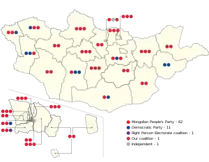 Las elecciones legislativas 2016 fueron ganadas por el entonces partido opositor Partido del Pueblo de Mongolia que obtuvo 65 escaños de los 76 miembros del parlamento contra 9 que obtuvo el entonces partido gobernante Partido Democrático del entonces Primer Ministro saliente Chimediin Saikhanbileg quién fue sucedido por Jargaltulgyn Erdenebat.[1]