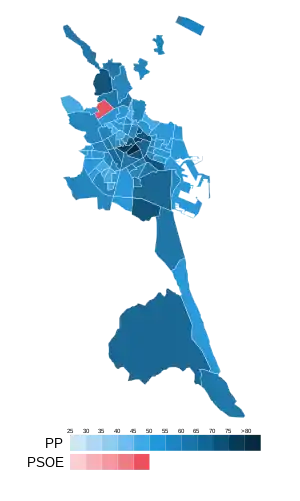 Solo dos candidaturas obtuvieron el mínimo del 5% de votos válidos necesario para obtener aspirar a representación. La del Partido Popular obtuvo mayoría absoluta de 21 escaños, mientras que la del Partido Socialista Obrero Español (PSOE) obtuvo los 12 escaños de concejal restantes.[2] Los resultados completos correspondientes al escrutinio definitivo se detallan a continuación:[3]