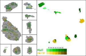 El oficialista Movimiento para la Democracia (MpD), que en general ha dominado el panorama municipal caboverdiano desde las primeras elecciones en 1991, obtuvo la victoria con el 48,29% de los votos válidamente emitidos en todo el país para camaristas municipales, emergiendo como primera fuerza en catorce de los veintidós municipios, sumando 81 camaristas y 178 asambleístas. Sin embargo, la principal fuerza de la oposición, el Partido Africano de la Independencia de Cabo Verde (PAICV) demostró un importante crecimiento de votos con respecto a los anteriores comicios, con un 40,01%, y arrebató al MpD el gobierno de cinco municipios, incluyendo Praia, capital y ciudad más poblada del país, así como tres localidades (São Domingos, Tarrafal y Ribeira Grande de Santiago), que no habían sido gobernadas por el partido desde la democratización. En total sumó 58 camaristas y 141 asambleístas.[2]