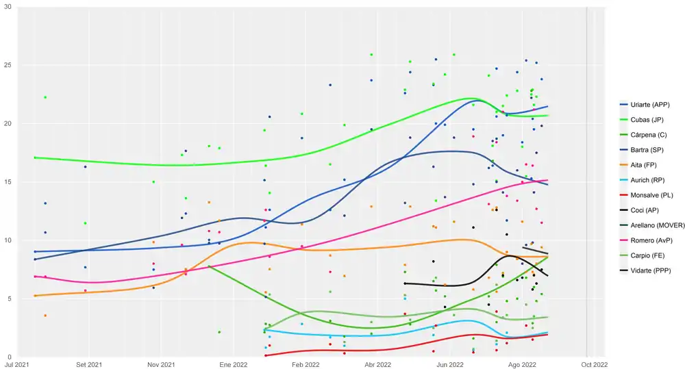 Opina Perú[p 10][lower-alpha 8] | 22 ago 2022 | ? | 21.6 | 19.5 | 21.2 | 14.1 | 7.1 | 6.0 | 7.0 | – | 3.5 | – | – | 0.4 | |