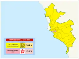 La elección municipal de Lima Metropolitana estuvo disputada por 13 candidatos.[5] Luis Castañeda Lossio obtuvo el primer lugar, siendo así reelecto para desempeñar el cargo de alcalde de Lima Metropolitana.[6]