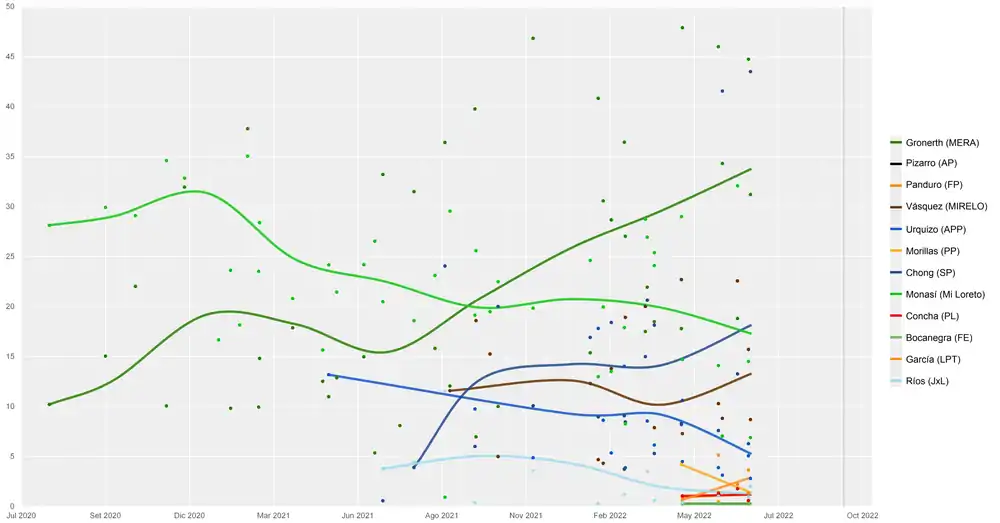 Loreto Investigación y Datos[p 5] | 21–30 ago 2022 | 1477 | 48.5 | 14.9 | 16.6 | 9.8 | 4.3 | 0.7 | 3.0 | 0.8 | 0.8 | 31.9 | |