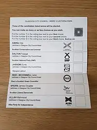 Se llevaron a cabo elecciones para todos los concejales en las 32 autoridades locales de Escocia. Las elecciones municipales se llevaron a cabo mediante el voto único transferible (STV), lo que da como resultado que el número de escaños ganados por cada partido refleje más proporcionalmente su parte de los votos.[14] Como consecuencia, las elecciones municipales en Escocia resultan más a menudo sin control general y las autoridades locales están gobernadas por administraciones minoritarias o de coalición.[14]
