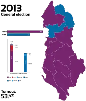 - Esta obra contiene una traducción automática total revisada derivada de «Albanian parliamentary election, 2013» de Wikipedia en inglés, concretamente de esta versión, publicada por sus editores bajo la Licencia de documentación libre de GNU y la Licencia Creative Commons Atribución-CompartirIgual 3.0 Unported.