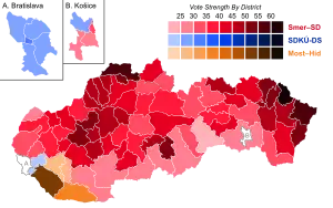 El primer ministro Robert Fico de Dirección-Socialdemocracia (SMER-SD) el partido aumentó su votación en 5%. Aun así, Fico afrontaría una verdadera batalla en su intento para convertirse en primer ministro, dado que sus socios de coalición se dieron un batacazo. El Partido Nacional Eslovaco (SNS) apenas superaría la barrera del 5% requerido para lograr la representación parlamentaria perdiendo 11 de sus 20 escaños, mientras que el Partido Popular– Movimiento por una Eslovaquia Democrática (ĽS-HZDS) perdería toda su representación.[10] A pesar de los contratiempos, Fico dijo que quiera intentar un gobierno en minoría que solo tenía 71 de los 150 escaños del parlamento y así forzaría la necesidad del apoyo de aunque sea uno de los partidos de oposición. Esto ha sido descrito como improbable, pero posible, porque los partidos de oposición declararon durante la elección que no introducirían gobierno con Fico. Un analista dijo que él "estrictamente regla[d] fuera que cualquiera del centro-los partidos correctos podrían equipo arriba con Smer."[11]