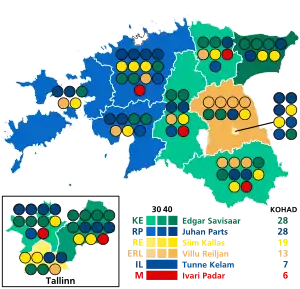 Sin embargo, los partidos del Centro y Res Publica dijeron que deberían tener la oportunidad de intentar formar el próximo gobierno,[10] mientras descartan cualquier acuerdo entre ellos.[11] El presidente Rüütel tuvo que decidir a quién nominar como primer ministro y, por lo tanto, tener la primera oportunidad de formar un gobierno.[11] El 2 de abril invitó al líder del partido Res Publica, Juhan Parts, a formar gobierno[12] y después de las negociaciones, el 10 de abril se formó un gobierno de coalición compuesto por Res Publica, el Partido Reformista y la Unión Popular de Estonia.[12]