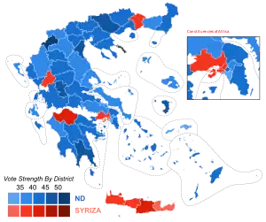 Los resultados mostraron que el partido Nueva Democracia, liderado por Kyriakos Mitsotakis, ganó 158 escaños, una mayoría absoluta que es más del doble de la representación previa del partido. El partido obtuvo casi el 40 % del voto popular.