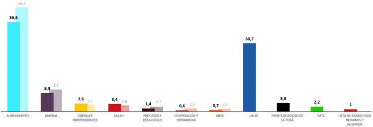 2: Unión entre Agudat Yisrael y Poalei Agudat Yisrael, que se presentaron separados en la elección anterior. Para la variante de escaños se tomó la unión de los escaños de cada partido.