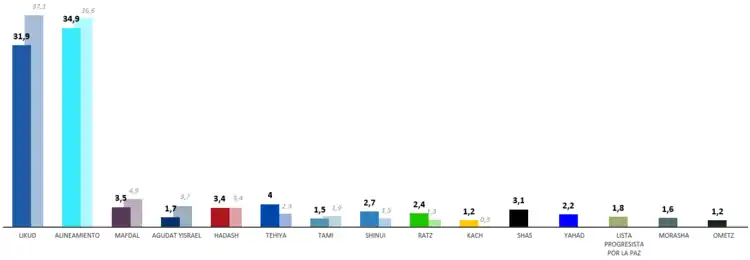 44 Alineamiento 41 Likud 5 Tehiya-Teztmot 4 Mafdal 4 Hadash 4 Shas 3 Shinui 3 Ratz |