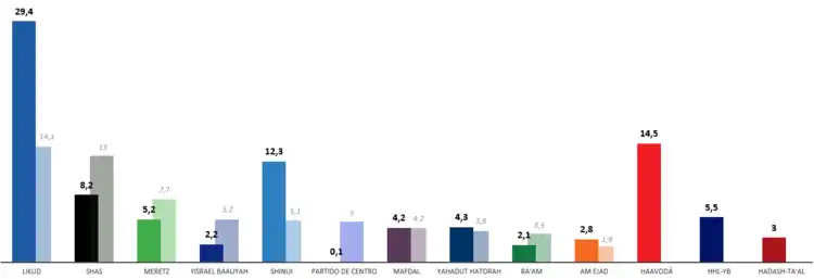 38 Likud 19 HaAvodá-Meimad 15 Shinui 11 Shas 7 Unión Nacional 6 Meretz-Yachad-Bekhira 6 Mafdal |