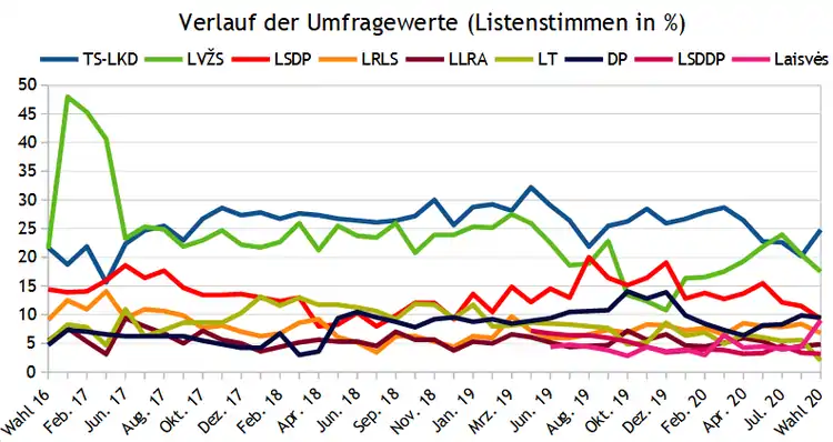Las elecciones de 2016 fueron una sorprendente victoria aplastante para la Unión de los Campesinos y Verdes Lituanos (LVŽS), que obtuvo 54 escaños, incluida la mitad de los distritos electorales uninominales. El gabinete de Saulius Skvernelis asumió el cargo con el apoyo de la LVŽS y el Partido Socialdemócrata de Lituania (LSDP). Este último partido se dividió en 2017 debido al desacuerdo sobre la participación en el gobierno, y algunos de sus parlamentarios formaron el Partido Laborista Socialdemócrata de Lituania (LSDDP) con miembros del Partido del Trabajo. Al carecer de apoyo en el Parlamento, el gobierno aprobó un acuerdo de cooperación con Orden y Justicia (TT) en 2018.