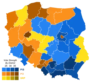 Los resultados finales mostraron un gran progreso para el PiS y el PO, que obtuvieron 155 y 133 escaños respectivamente en el Sejm, y 49 y 34 escaños en el Senado. Autodefensa, una agrupación populista que aboga por la agricultura financiada por el Estado y un aumento en los programas sociales del gobierno, quedó en tercer lugar en el Sejm con 56 escaños. El SLD sufrió una fuerte derrota, conservando solo 55 escaños en el Sejm y ninguno en el Senado. Estas elecciones marcaron los peores resultados de la izquierda desde su establecimiento como comunistas reformados en 1990. El PiS y el PO no pudieron ponerse de acuerdo sobre la formación de un gobierno de coalición. En consecuencia, el nuevo primer ministro, Kazimierz Marcinkiewicz, formó un gobierno minoritario de un solo partido el 31 de octubre. El 10 de noviembre de 2005, el primer ministro designado Marcinkiewicz ganó un voto de confianza en el Sejm, con el apoyo de los mismos grupos que en la votación anterior, así como de cinco de seis parlamentarios independientes.[2]