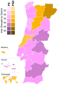 NOTA: La circunscripción de Viseu y de Guarda eligen, ambos, un diputado menos que en los anteriores comicios, mientras que los de Oporto e Lisboa eligen, ambos, uno más. |