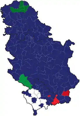El Partido Progresista Serbio y su alianza ganó las elecciones por abrumadora mayoría, [2] obteniendo el 48,35% de los votos y una mayoría absoluta de 158 escaños. Su antiguo socio, la Alianza del Partido Socialista de Serbia, igualó su logro anterior con 13,49% y 44 escaños, mientras que solo dos listas no étnicas más superaron el umbral del 5%: el Partido Democrático (DS) con 6,03% y 19 escaños, y la Alianza del Partido Socialdemócrata liderado por el expresidente Boris Tadić con un 5,70% (18 escaños). [1] Varios partidos de larga data, en particular el Partido Democrático de Serbia, Regiones Unidas de Serbia y el Partido Liberal Democrático, no lograron alcanzar el umbral del 5%. [3]