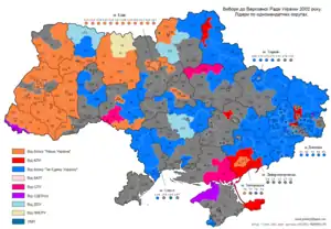 Las elecciones parlamentarias se celebraron en Ucrania el 31 de marzo de 2002.[1] El Nuestro bloque de Ucrania emergido como la facción más grande en el Verkhovna Rada, ganando 111 de los 447 asientos.[2]