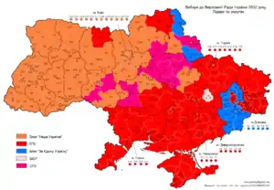 Yúshchenko es Nuestra Ucrania reunió la mayoría de su soporte de regiones occidentales y centrales de Ucrania, incluyendo la ciudad de Kiev. El Partido Comunista recibió la mayoría de sus votos de regiones orientales y del sur, así como de Crimea. Para Unió bloque de Ucrania, el cual incluyó el partido de Victor Yanukóvich de Regiones, conseguía la mayoría de sus votos de regiones orientales de Ucrania. Donetsk Oblast Era el baluarte del bloque, donde reciba más de dos veces el número de votos (36.83%) comparó a la región de apoyo más alta próxima: Sumy Oblast con 17.05% de los votantes de la región. Yulia Tymoshenko el soporte del bloque vino predominantemente de regiones occidentales, mientras los Socialistas eran más apoyados en las regiones centrales. Mientras el Tymoshenko el bloque recibió más del voto nacional comparó al Partido Socialista, no obtenga una pluralidad en cualquier de las regiones, mientras el Partido Socialista dirigió asegurar pluralidad de votos en Poltava Oblast con 22.05%.