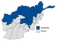 Los resultados preliminares se anunciaron el 22 de diciembre[2] y los resultados finales el 18 de febrero de 2020. Abdullah Abdullah rechazó los resultados y pidió la formación de un gobierno paralelo en el norte de Afganistán.[3] El 22 de febrero, Abdullah nombró un nuevo gobernador leal a sí mismo en la provincia de Sar-e Pul.[5]