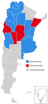 Finalmente, el resultado fue un triunfo holgado para la fórmula Juan Domingo Perón-Hortensio Quijano, de la conjunción laborista-radical renovadora con el 53,71% de las preferencias contra el 43,65% de la fórmula José Tamborini-Enrique Mosca, de la Unión Democrática.[30] Debido al sistema de escrutinio mayoritario por lista completa empleado para estas elecciones, el Colegio Electoral tuvo una abrumadora mayoría peronista, con 304 electores de la conjunción laborista-radical renovadora, en su mayoría ligados al Partido Laborista, y 72 de la Unión Democrática, que en su mayoría respondieron a la Unión Cívica Radical (UCR). El naciente peronismo triunfó en la Capital Federal, y en las provincias de Buenos Aires, Catamarca, Entre Ríos, Jujuy, La Rioja, Mendoza, Salta, Santiago del Estero y Tucumán. La Unión Democrática, por su parte, triunfó solamente en el bastión radical de Córdoba, así como en San Juan,[31] y en los distritos mayormente conservadores de San Luis y Corrientes.[32] El resultado más contundente del peronismo fue en Tucumán, donde logró el 72,47% de los votos,[33] mientras que el más bajo fue en San Juan, con un 34,51%. Tamborini logró el 62,85% de los sufragios en Corrientes, a pesar de que esta era la provincia natal del compañero de fórmula de Perón, Quijano; mientras que el peor resultado para la Unión Democrática fue en el distrito tucumano, con el 27,53%.[32]