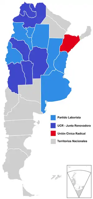 Con un amplio consenso histórico al respecto, la nota más destacada de la elección provincial fue la provincia de Corrientes, único distrito donde el peronismo no accedió a la gobernación.[39] La fragmentación en más de cinco fórmulas entre conservadores, radicales y peronistas provocó un Colegio Electoral en el que el PL y la UCR-JR no tenía mayoría, y los partidos conservadores tampoco. Con la UCR como único contrapeso y dada su intransigencia absoluta a votar una fórmula que no fuera la suya, los electores del Partido Demócrata Nacional (PDN) y del Pacto Autonomista - Liberal (PAL), que habían sido la unidad más votada, optaron por investir gobernador al radical Blas Benjamín de la Vega para evitar que el peronismo tomara el control de la provincia.[39] Tras su derrota, la dirigencia laborista-radical renovadora rechazó esta investidura por diversos medios, pero el Ministerio de Interior aceptó reconocer el resultado poco antes de la juramentación de De la Vega.[39]