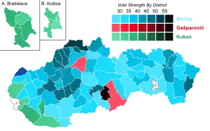 La primera vuelta se realizó el 3 de abril.[1] Gašparovič obtuvo el 22.3% de los votos y Mečiar el 32.%, clasificando ambos para un balotaje. El resultado fue considerado sorprendente, en primer lugar porque no se esperaba que Gašparovič llegara a segunda vuelta, sino que se las encuestas afirmaban que Eduard Kukan quedaría primero con algo más del 30%. Gašparovič superó a Kukan por unos 4.000 votos, eliminándolo en primera vuelta. Gašparovič más tarde contó que ni él mismo se esperaba el resultado, sino que se fue a dormir temprano ese día y que no se enteró de que había clasificado para el balotaje hasta que unos amigos lo llamaron para felicitarlo durante la noche.[3] El presidente incumbente, Rudolf Schuster, se presentó para la reelección, pero tras la disolución de su partido (el Partido del Entendimiento Civil) el año anterior, perdió gran parte de su apoyo político y quedó cuarto con algo más del 7% de los votos, por lo que se retiró de la política.[4]