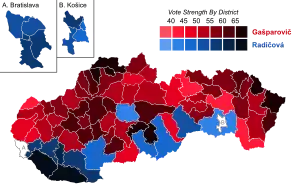 Hubo siete candidatos en la primera vuelta, celebrada el 21 de marzo.[2] Gašparovič obtuvo fácilmente la segunda fuerza con un 46.71% de los votos, mientras que Radičová obtuvo una cantidad sorprendentemente alta del 38%, pasando ambos a segunda vuelta.[1] Los otros cinco candidatos recibieron menos del 6%.[3] La participación para la primera ronda fue solo del 47.9%, un leve aumento con respecto a la elección anterior.[3]