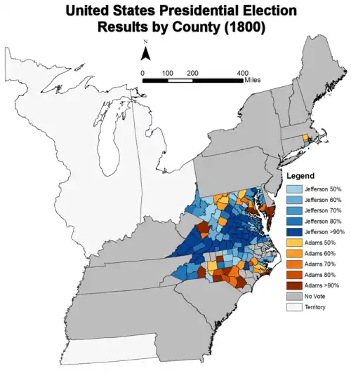 Jefferson, y Burr, ganaron a todos o la mayoría de los votantes en cada estado que había ganado en 1796, y adicionalmente ganó mayorías en Nueva York y Maryland. Adams obtuvo votos en Pensilvania y Carolina del Norte, pero estos votos no fueron suficientes para compensar las victorias demócratas-republicanas en otros lugares. De los 155 condados y ciudades independientes que regresaron, Jefferson y Burr ganaron en 115 (74.19%), mientras que el boleto Adams llevó 40 (25.81%). Esta fue la última vez que Vermont votó por los federalistas.