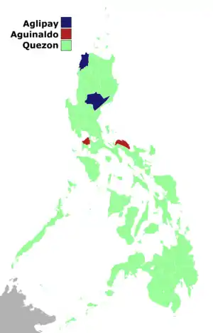 Quezón triunfó en casi todas las provincias, excepto en la provincia de origen de Aguinaldo, Cavite, y en la de Aglipay, Ilocos Norte. Aguinaldo mostró fuerza inicialmente en las provincias de Bicol en los primeros resultados, pero Quezón finalmente triunfó en aquella región.[1] Aglipay también estuvo por triunfar en Nueva Vizcaya, pero los Nacionalistas se impusieron. Osmeña también llevó a todas las provincias excepto Cavite, en la que Melliza ganó por un margen muy estrecho. La hazaña de Osmeña es inigualable hasta la fecha.[2]