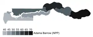 Los resultados preliminares hechos públicos por la comisión electoral el día después de la elección, dan al presidente saliente como el ganador con una gran ventaja. Barrow obtuvo más del 53% de los votos contra el 27% de Darboe, que quedó en segundo lugar.[5][6]