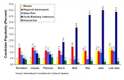 En diciembre de 2003, la Fundación Internacional para Sistemas Electorales (IFES) comenzó un estudio de seguimiento para evaluar la popularidad de los candidatos potenciales. El estudio continuó hasta la realización de la primera vuelta el 5 de julio e incluyó a trece posibles candidatos a la presidencia. La primera encuesta del IFES daba un estrecho triunfo para Megawati. Sin embargo, al momento de realizarse la elección legislativa de 2004, se situó a la cabeza de las encuestas el general retirado Susilo Bambang Yudhoyono. Otros candidatos potenciales eran Akbar Tanjung, líder del DPR, y el Sultán de Yakarta Hamengkubuwono X.[6]