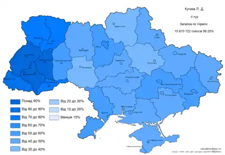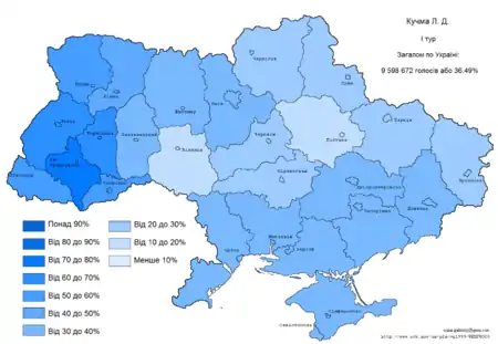 En la primera vuelta, en la mayoría de las provincias y el distrito fuera del país, las elecciones fueron ganadas por Leonid Kuchma. En siete provincias el principal candidato fue Petro Symonenko, principalmente en el centro y el sur. Oleksandr Moroz logró convertirse en el líder en los más orientados al agrarismo Óblasts de Poltava y Vinnytsia. Nataliya Vitrenko tocó la cima de la lista de candidatos en el óblast de Sumy.