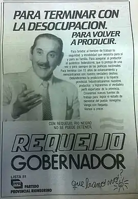 El Partido Provincial Rionegrino, encabezado por Requeijo, mantuvo una estrategia neoconservadora ligada a lo que se conoce como «antipolítica», que cuestionaba las ideologías definidas como un lastre al momento de encarar una gestión eficiente.[8] Requeijo rescató los logros obtenidos durante su gestión entre 1969 y 1972, y retuvo las mismas banderas bajo las que había encarado su campaña en 1973: la integración provincial, el estado de bienestar y el desarrollo del sur de la provincia. Varios de los candidatos del partido no ejercían actividad política previa y se identificaban a sí mismos como ciudadanos independientes, lo que a la postre dificultaría la capacidad del partido para consolidarse como una fuerza coherente después de su crecimiento. En su discurso de cierre de campaña, Requeijo criticó «esa propaganda agobiante, cargada de ideología, que le está mintiendo al pueblo». Otras frases emitidas por candidatos del partido, tales como «acabar con la lucha ideológica-filosófica» o la idea de «despolitizar la acción del gobierno» evidenciaron este enfoque que buscaba rivalizar con los partidos tradicionales.[1]