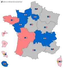 Luego de la primera vuelta, el Partido Socialista retiró sus listas en las regiones de Provenza-Alpes-Costa Azul y Norte-Paso de Calais-Picardía (ganadas por las candidatas del Frente Nacional Marion Maréchal-Le Pen y Marine Le Pen, respectivamente), donde terminaron en tercer lugar, en un intento de bloquear al Frente Nacional de ganar escaños en la segunda ronda debido a que la oposición concurriría dividida en bloques de centroizquierda y centroderecha.[4] Sin embargo, los socialistas optaron por mantener su lista en la región de Alsacia-Lorena-Champaña-Ardenas, que de igual manera los tenía en tercera posición y al FN con una ventaja considerable después de la primera ronda.[5]