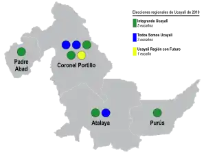 Elecciones regionales de Ucayali de 2010 | 3 oct 2010 | — | 34.9 | 34.0 | 14.1 | 10.0 | 3.6 | 0.9 | ||