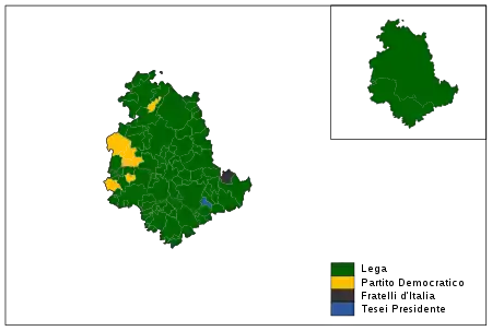 Donatella Tesei, respaldada por la coalición de centroderecha compuesta por la Liga de Salvini, Hermanos de Italia de Meloni y Forza Italia de Berlusconi, ha sido elegida gobernadora con el 57,6% de los votos. El candidato de la coalición compuesta por el centroizquierda (liderado por el Partido Democrático) y el Movimiento 5 Estrellas perdió frente al centroderecha por más de 20 puntos porcentuales. Umbría marca la octava victoria consecutiva de la centroderecha en las votaciones regionales desde las elecciones generales de marzo de 2018.[54]