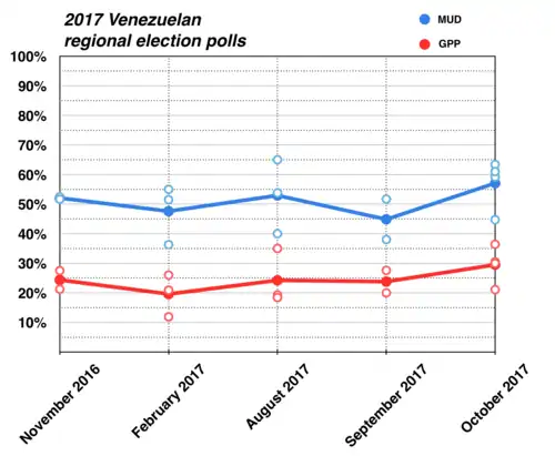 El 18 de octubre de 2016 la presidenta del CNE, Tibisay Lucena, anunció que las elecciones regionales se realizarán a finales del primer semestre de 2017,[7] declarando que el retraso se debe a una llamada "guerra económica" y los bajos precios del petróleo. Fuentes del gobierno indicaron que la verdadera razón del retraso fue la esperanza de que los precios del petróleo más altos pueden aumentar la popularidad del PSUV.[8]