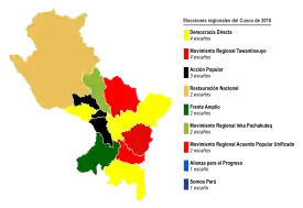 4 Democracia Directa 2 Frente Amplio 2 Movimiento Regional Inka Pachakuteq 3 Acción Popular 4 Movimiento Regional Tawantinsuyo |