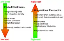 El beneficio más importante de la impresión es la fabricación de volumen a bajo costo. El menor costo permite su uso en otras aplicaciones. Un ejemplo son los sistemas RFID, que permiten la identificación sin contacto en el comercio y el transporte. En algunos ámbitos, como la impresión de los diodos emisores de luz no afecta el rendimiento. La impresión en sustratos flexibles permite a la electrónica que sea colocada en superficies curvas, por ejemplo, poniendo las células solares en los techos de los vehículos. Más típicamente, los semiconductores convencionales justifican sus costos mucho más altos, proporcionando un rendimiento mucho mayor.