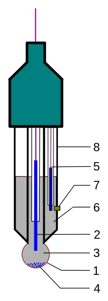 La parte inferior del electrodo de pH termina en una burbuja redonda de vidrio delgado. El electrodo de pH, puede pensarse como un tubo dentro de un tubo. El tubo más interno, contiene una solución invariable de HCl 1×10−7 mol/l. También dentro de este tubo interno se encuentra el polo catódico de la sonda de referencia. El polo anódico se envuelve alrededor de la parte exterior del tubo interno y termina en una sonda de referencia del mismo tipo que la que se encuentra en el interior del tubo. Esta se encuentra llena con una solución de referencia de KCl 0,1 mol/l y se encuentra en contacto con la solución que se encuentra en el exterior de la sonda de pH por medio de un conducto poroso que hace las veces de puente salino.
