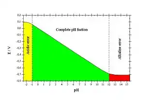 - Rango de error alcalino - a bajas concentraciones de iones hidrógeno (altos valores de pH), las contribuciones de los metales interfirientes tales como Li, Na, K, son comparables en magnitud a las producidas por los iones hidrógeno. En esta situación la dependencia del potencial con respecto al pH se vuelve no lineal. El efecto por lo general ya es notable a pH 12, y a concentraciones de litio o sodio de 0,1 mol/l o mayores. Los iones potasio por lo general provocan menos errores que los iones sodio.