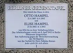 Otto y Elise Hampel fueron una pareja de ciudadanos alemanes que resistieron al nazismo en Berlín, siendo ejecutados en la guillotina el 8 de abril de 1943. Su historia fue inmortalizada en la novela de Hans Fallada de 1947, Solo en Berlín.