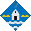 - «Escudo en losange de ángulos rectos: de azur, una barraca de argén cerrada de sable, acompañada al jefe de una espiga de arroz de argén y a la punta de dos fajas ondadas de argén y acostada de cuatro dunas abscisas y yuxtapuestas de oro, dos a cada lado.»[2]