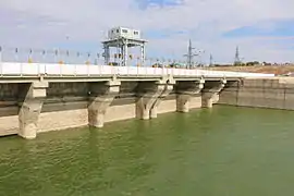 La presa principal y la central hidroeléctrica se encuentran en el norte, junto a la ciudad de Shardara. Al sudoeste se ha construido otra represa, de materiales sueltos de unos 2 km de longitud, que separa el embalse del lago de Aydarkul, también llamado embalse de Arnasay, en la provincia de Arnasasy, en Uzbekistán, separado por una presa similar del gran lago Aidar, en el país vecino.