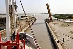 La presa está formada por un desaguadero de 170 m de largo, 35 m de ancho y 18 m de alto con siete segmentos o pasos de agua de 20 x 11,5 m y una capacidad de desagüe de 6.500m³/s. En el lado sur se ha construido una esclusa para barcos de 13 m de anchura y 175 m de largo con un puente basculante para facilitar la navegación. Al norte se extiende un dique de materiales sueltos de 440 m de largo.[1]