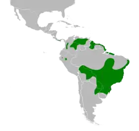 Se distribuye de forma disjunta: desde el sur de Costa Rica, hasta el centro de Panamá; en los Andes del oeste de Colombia; desde el este de Colombia hasta el noreste de Venezuela; en Guyana, adyacencias del extremo norte de Brasil y litoral atlántico de Surinam, Guayana Francesa y norte de Brasil; en el norte de Perú y sur de Ecuador; y en una extensa área desde el noreste, centro y oeste de Brasil (al sur de la Amazonia, en donde está prácticamente ausente), extremo sureste de Perú, norte y este de Bolivia, este de Paraguay, hasta el noreste de Argentina, sur de Brasil y norte de Uruguay.