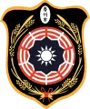 El borde exterior del círculo rojo muestra gavillas de trigo y el interior gavillas de arroz, que juntas representan a los trabajadores agrícolas. En el centro de la parte inferior del borde hay una rueda dentada que representa a los trabajadores industriales.